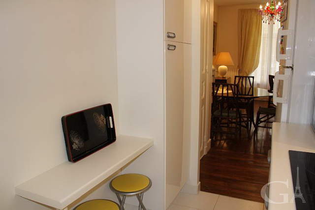 The studio is situated on the 8th floor of a building with elevator; surface is 9 square meters; view of the Eiffel Tower.