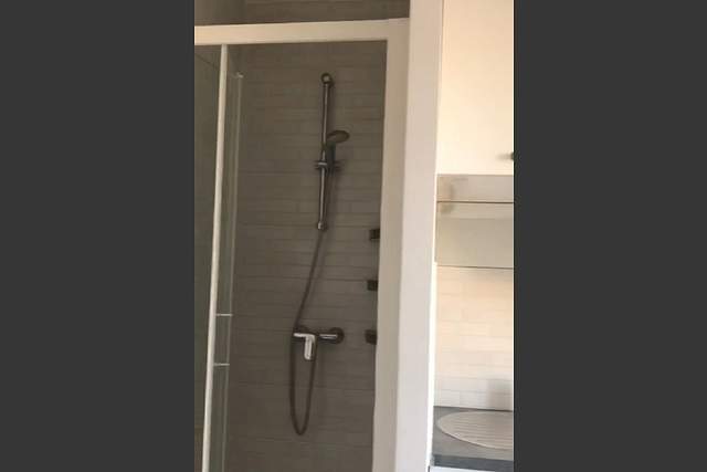 The flat has a bed; a kitchen space with a refrigerator, a sink, an electric stove, cabinets; a shower.