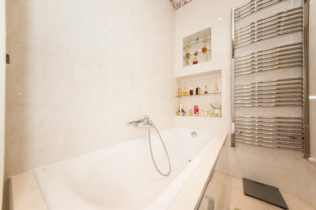 The bathroom is equipped with a bath tub, a shower, a washbasin, a mirror and it is separated from the toilet.