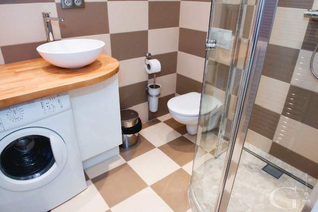The separate kitchen has a window facing a quit courtyard, and it is equipped with all kitchen utensils: microwave, toaster, vitro ceramic cookstove, oven, extractor hood, fridge, freezer, dishwasher, coffee maker, kettle, TV. It has a bar counter with white seats. Tiled floor.