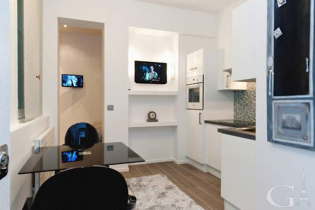The living room is decorated in gray colors, and it is furnished with : two sofas, a glassy coffee table, armchair, cable, plasma TV, decorative fireplace. It has 2 double-glazed windows facing the street. Parquet floor.
