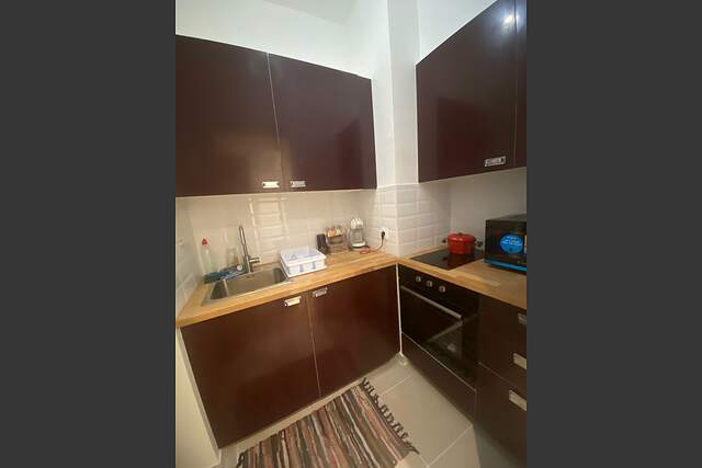 The apartment consists of a living room (a sofa, bookshelves, a coffee table), a bedroom (a bed, a desk, an armchair, TV), a fitted kitchen\dining room, a bathroom with WC.