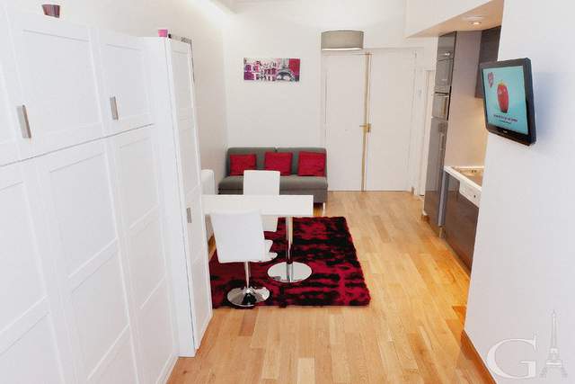 The flat has a basic set of furniture and home appliances, and its surface area is just 14 square meters. It's situated on the 5th French floor of the building and has an elevator. The minimum rental term for the apartment is one month, and a deposit is mandatory.