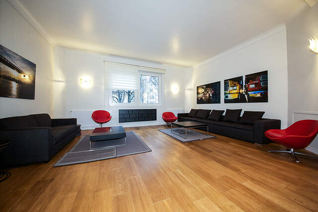 Spanning 200 square meters and situated on the 1st French floor of the building, this residence features elegant parquet flooring, high windows, and a bright, light-filled interior.