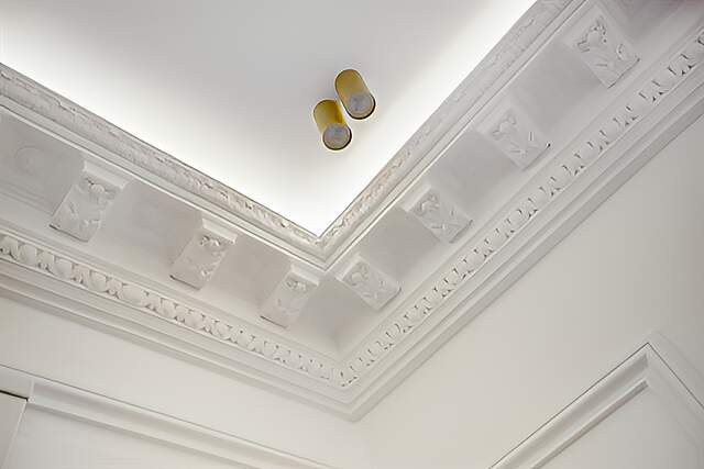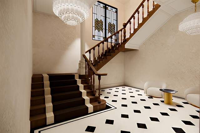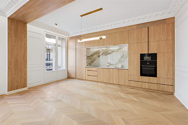 The parquet floors, moldings, and original fireplaces have been preserved, emphasizing its historical charm.