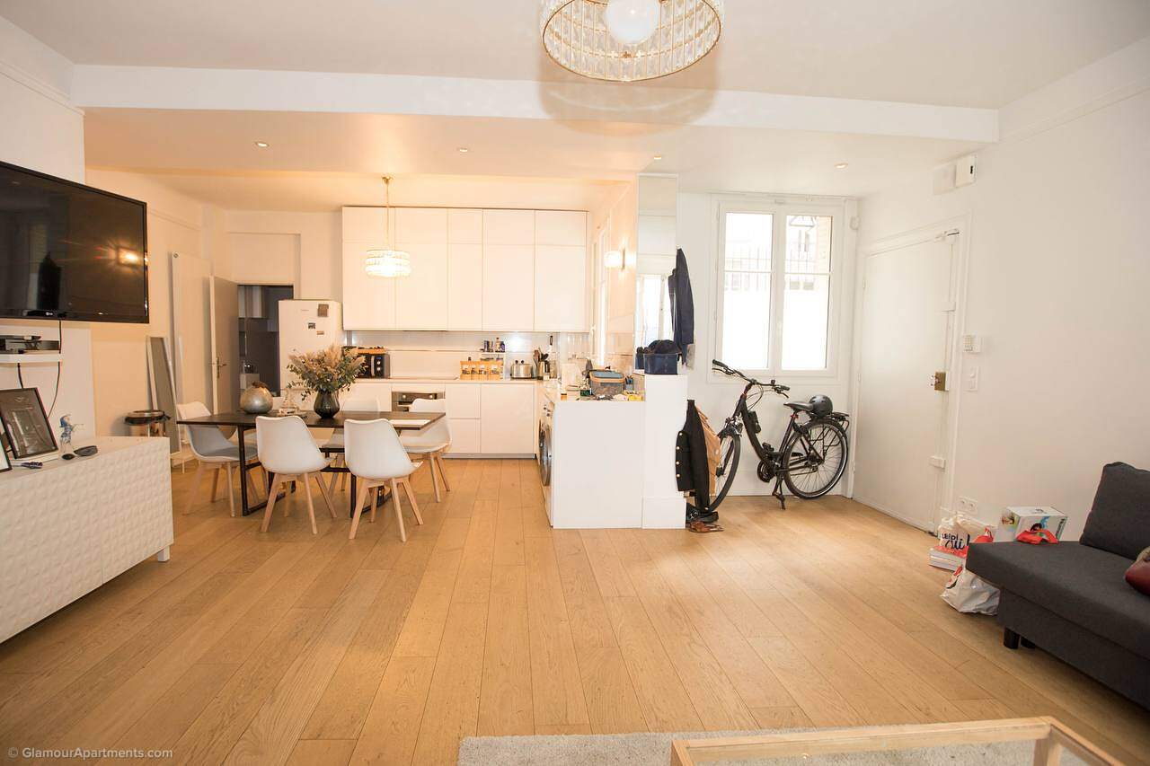 The apartment fits perfectly into the surrounding infrastructure: just a two-minute walk away there is a park, and restaurants, stores and bakeries are within 2-5 minutes walks. International schools and prestigious French educational institutions are also close by, making this neighborhood ideal for families.