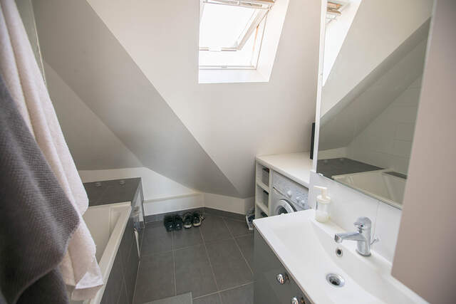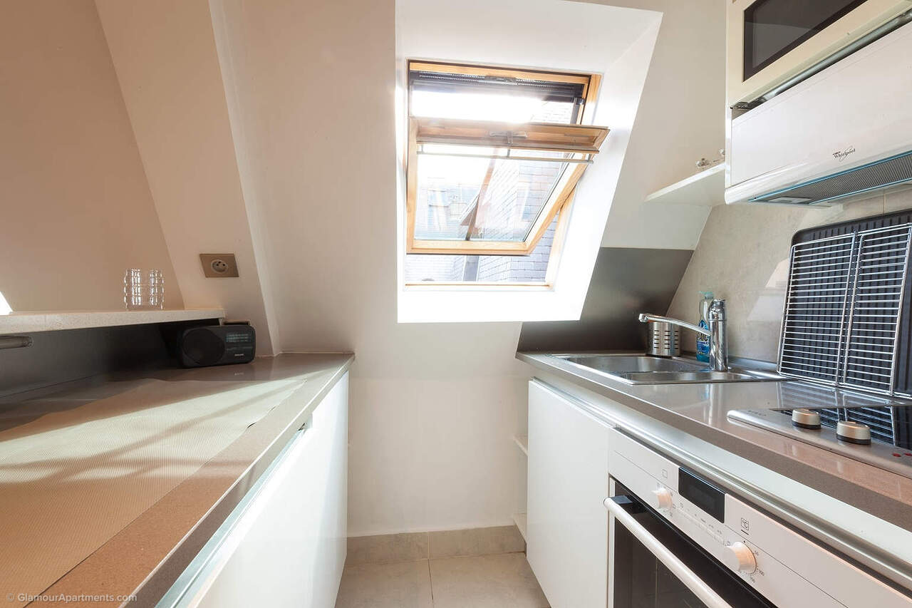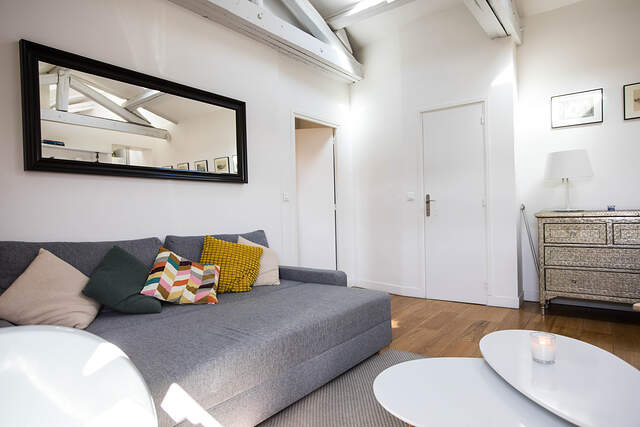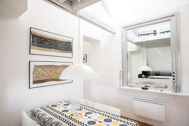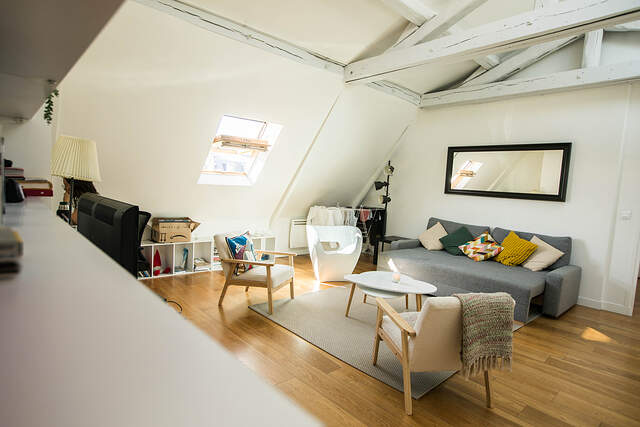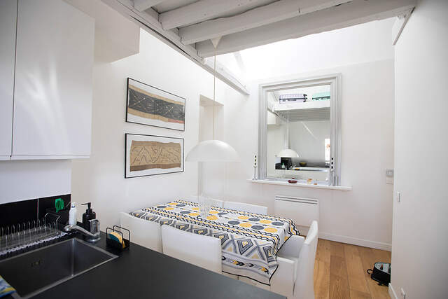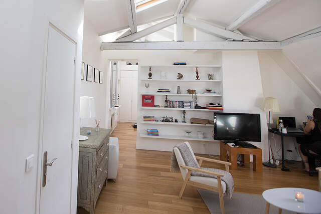 It offers almost 40 square meters of living space on the 4th French floor of a building with elevator, concierge and parking.