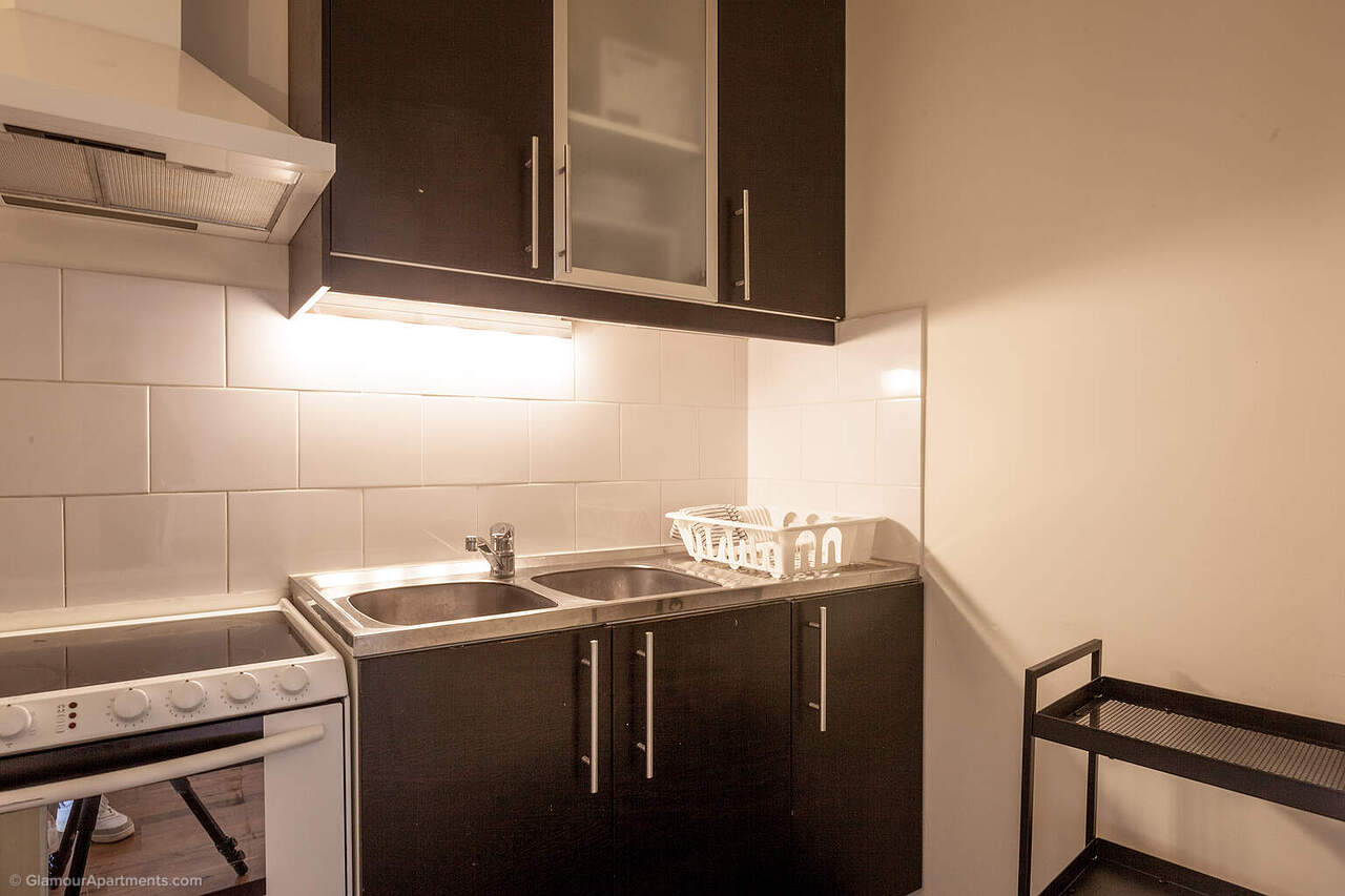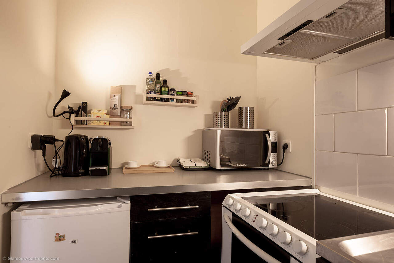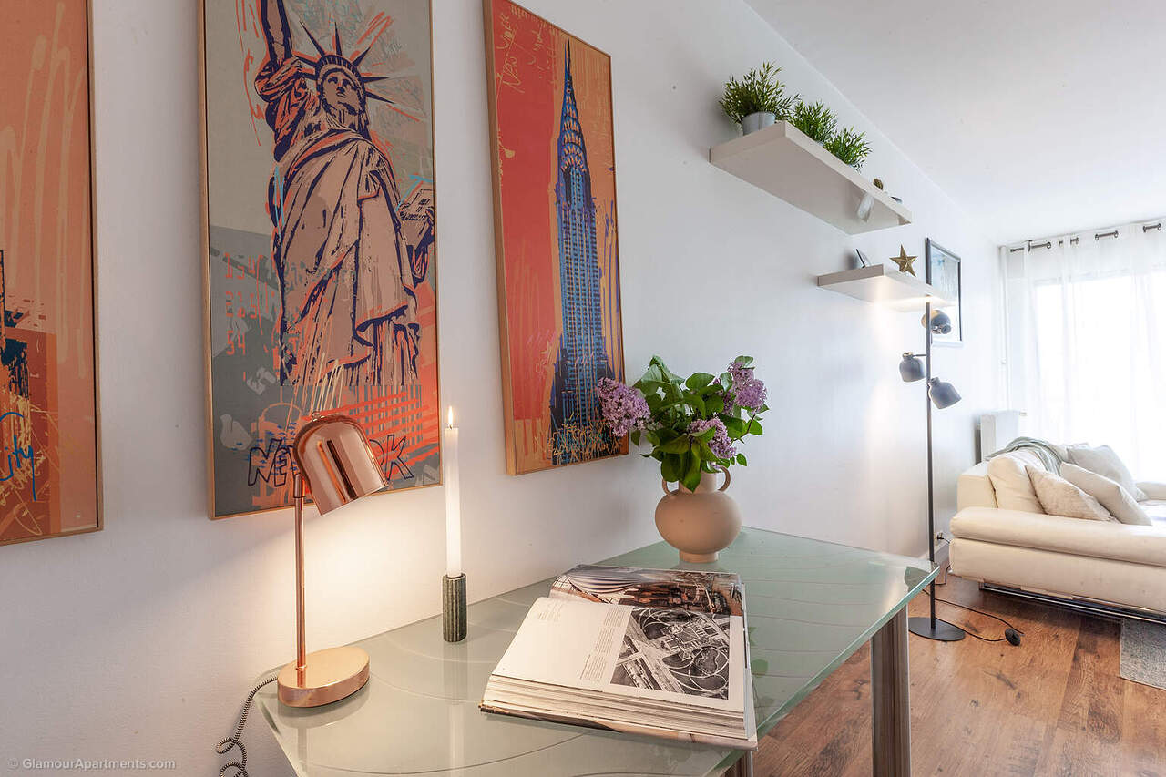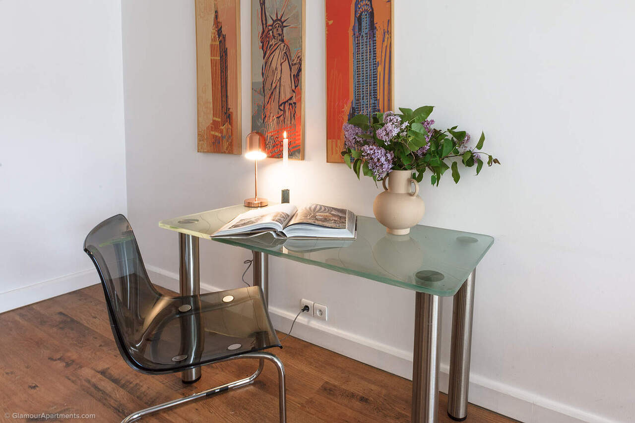 The spacious main room combines the living and sleeping areas and includes space for a desk, while the separate kitchen is fully equipped with all necessary appliances. Light‑coloured finishes and large windows enhance the sense of volume and make the space highly functional.